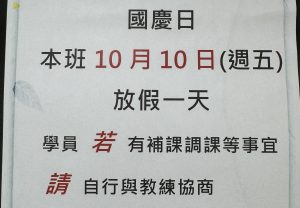 10月10日(五)國慶日放假一天 學員若有補課、調