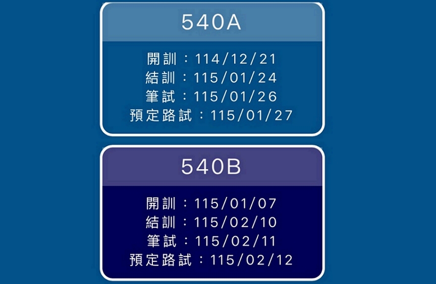 請參考網頁下方--近期開課期別,考試時間由監理所制定,無法更換考試時間,請先確認該期筆試、路試日期是否可以出席,一旦報名若無法出席,則視同缺考,請按照本班缺考流程辦理複訓。